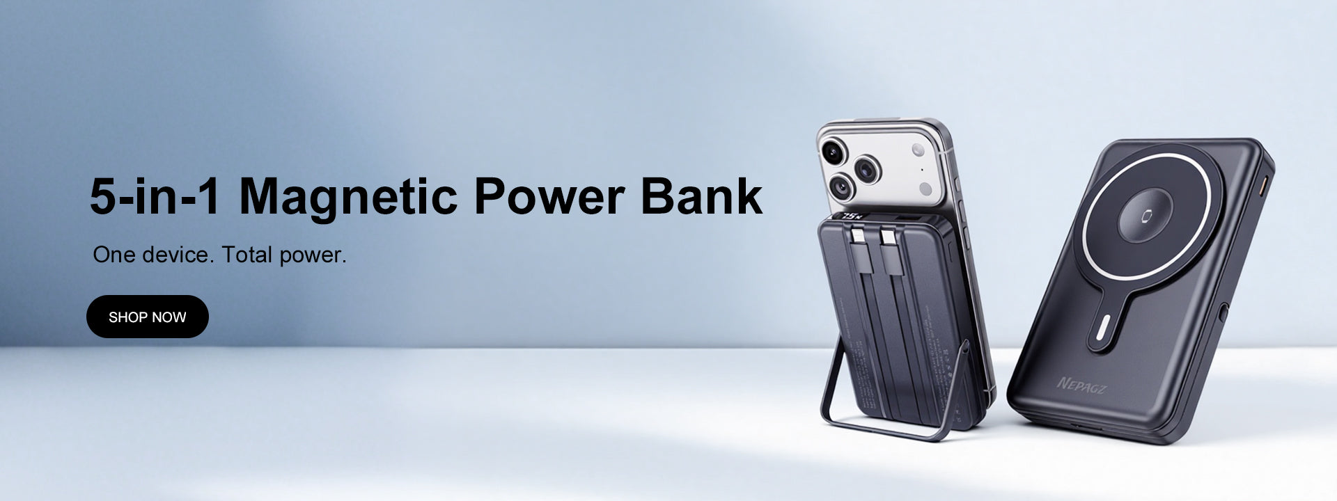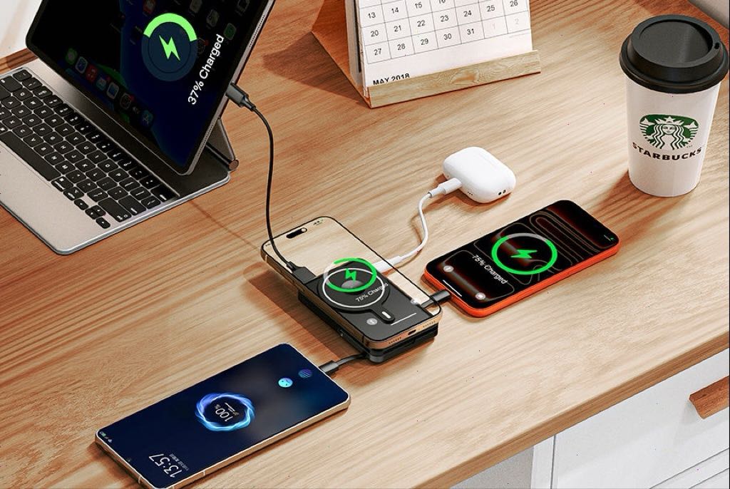 A magnetic power bank with multi-device charging support and a built-in foldable stand.